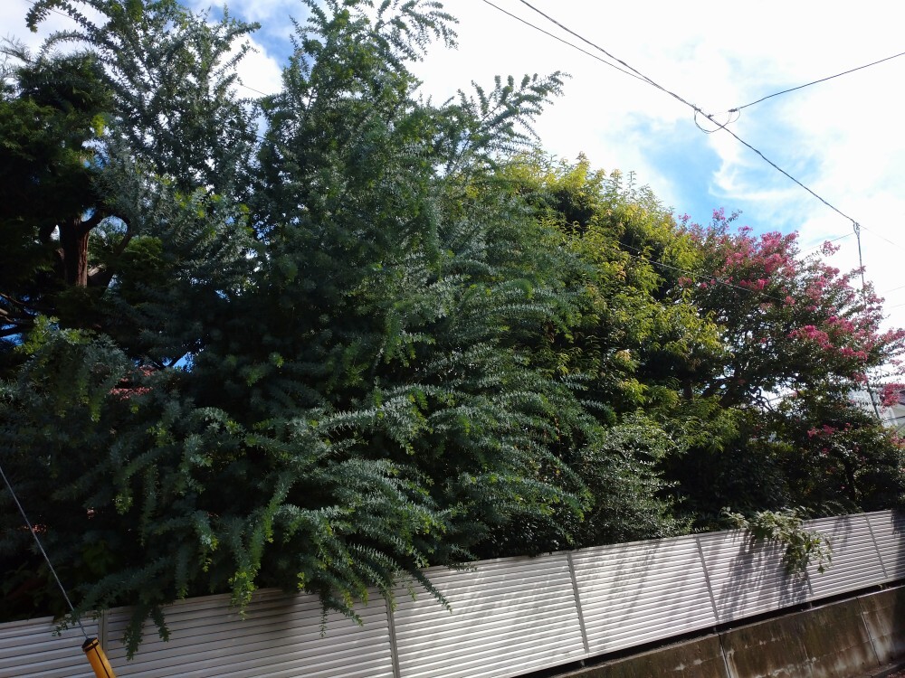 伸び放題の元気な植木。道路へも枝を張り出しご近所さんの苦情にもなりかねません。